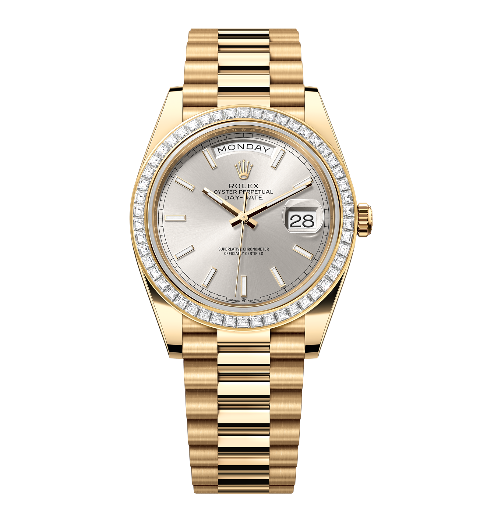 Rolex Day-Date – 40 mm – זהב צהוב לוח אפור באזל יהלומים גימור קצה