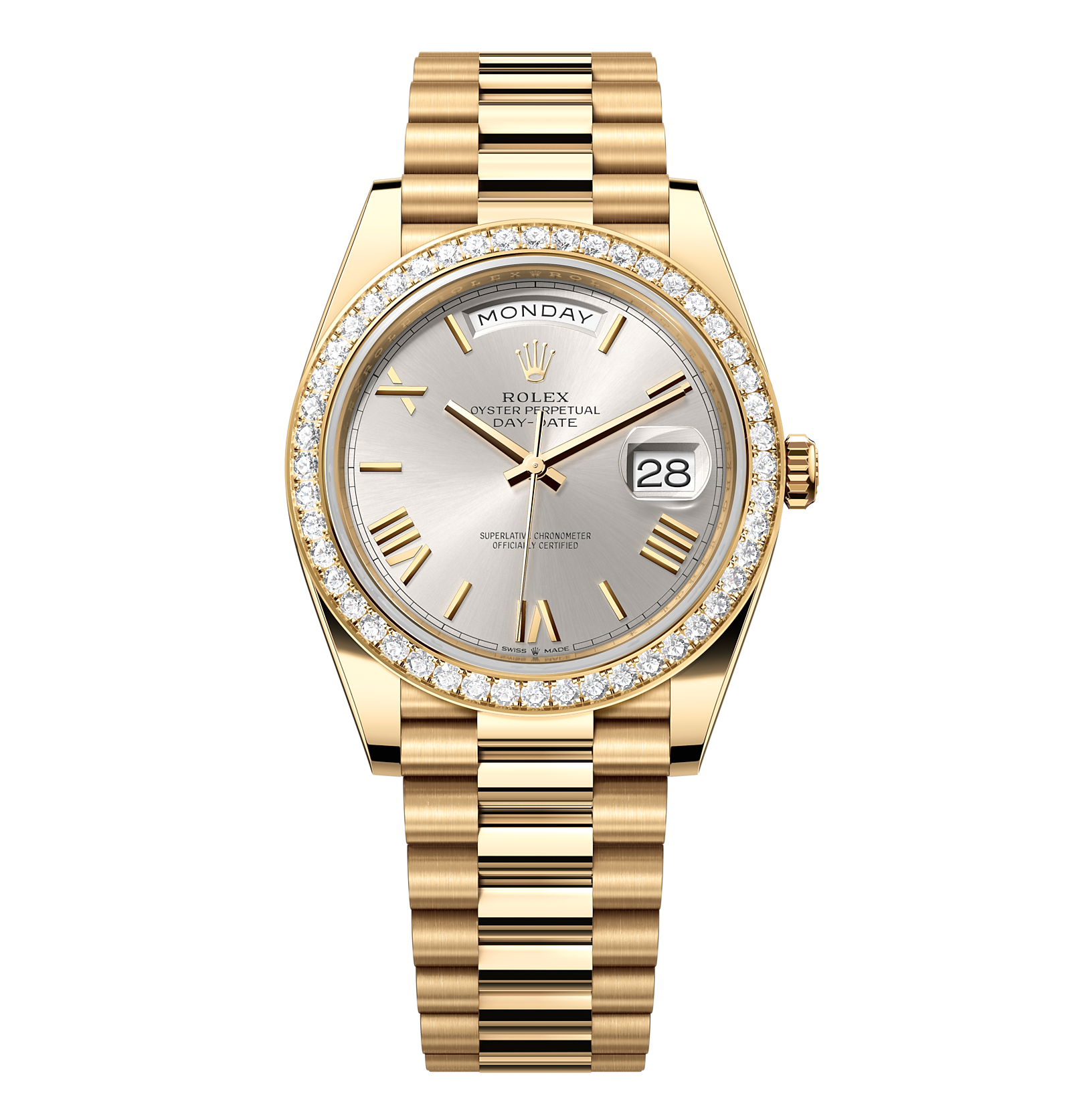 Rolex Day-Date – 40 mm – זהב צהוב לוח אפור רומי באזל יהלומים גימור קצה