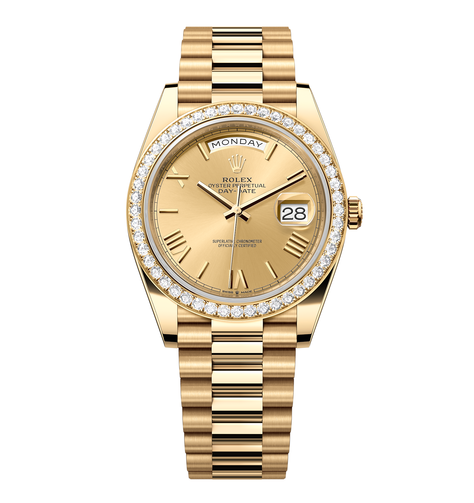 Rolex Day-Date – 40 mm – זהב צהוב לוח זהב צהוב רומי באזל יהלומים גימור שוויצרי