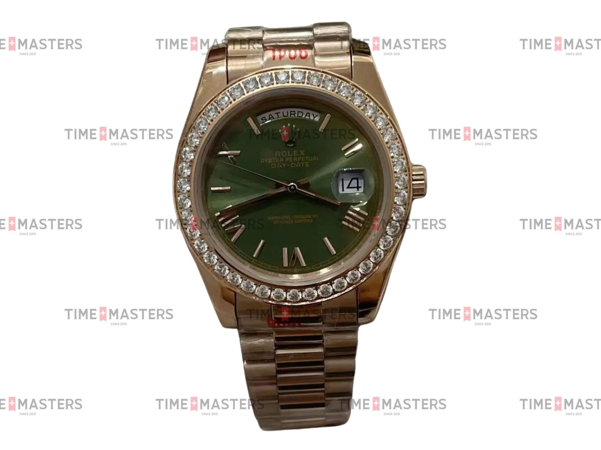 Rolex Day-Date – 40 mm – זהב צהוב לוח ירוק רומי באזל יהלומים גימור שוויצרי