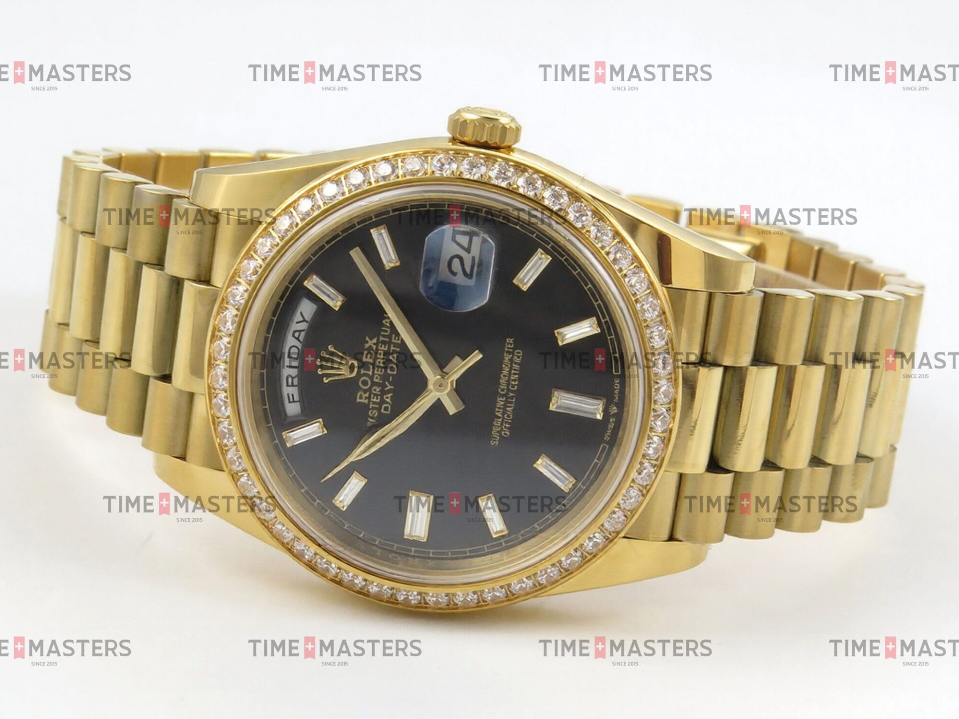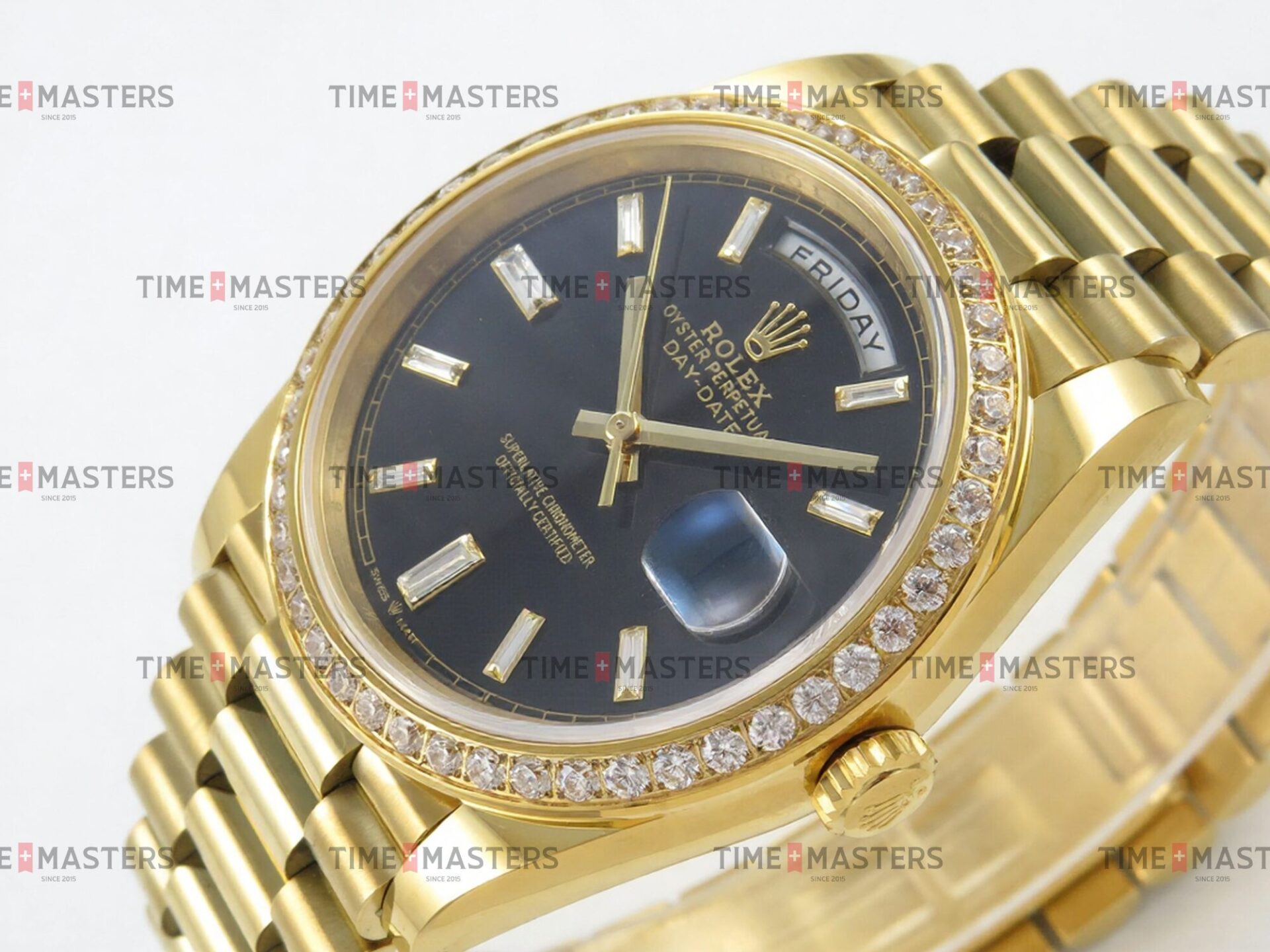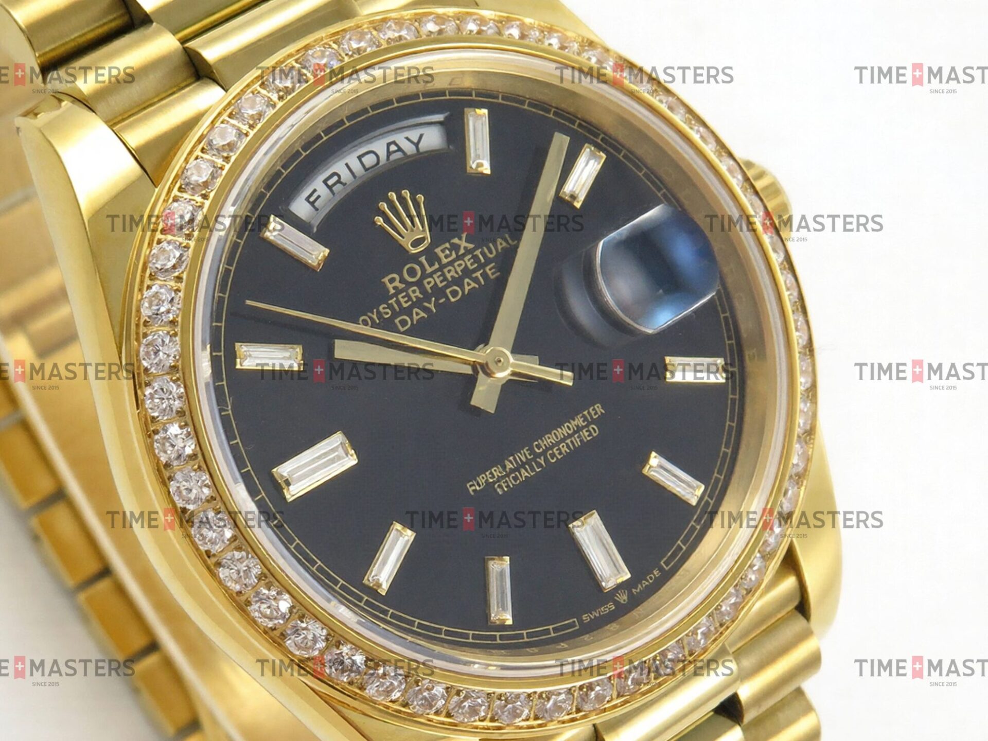 Rolex Day-Date – 40 mm – זהב צהוב לוח שחור יהלומים באזל יהלומים גימור קצה
