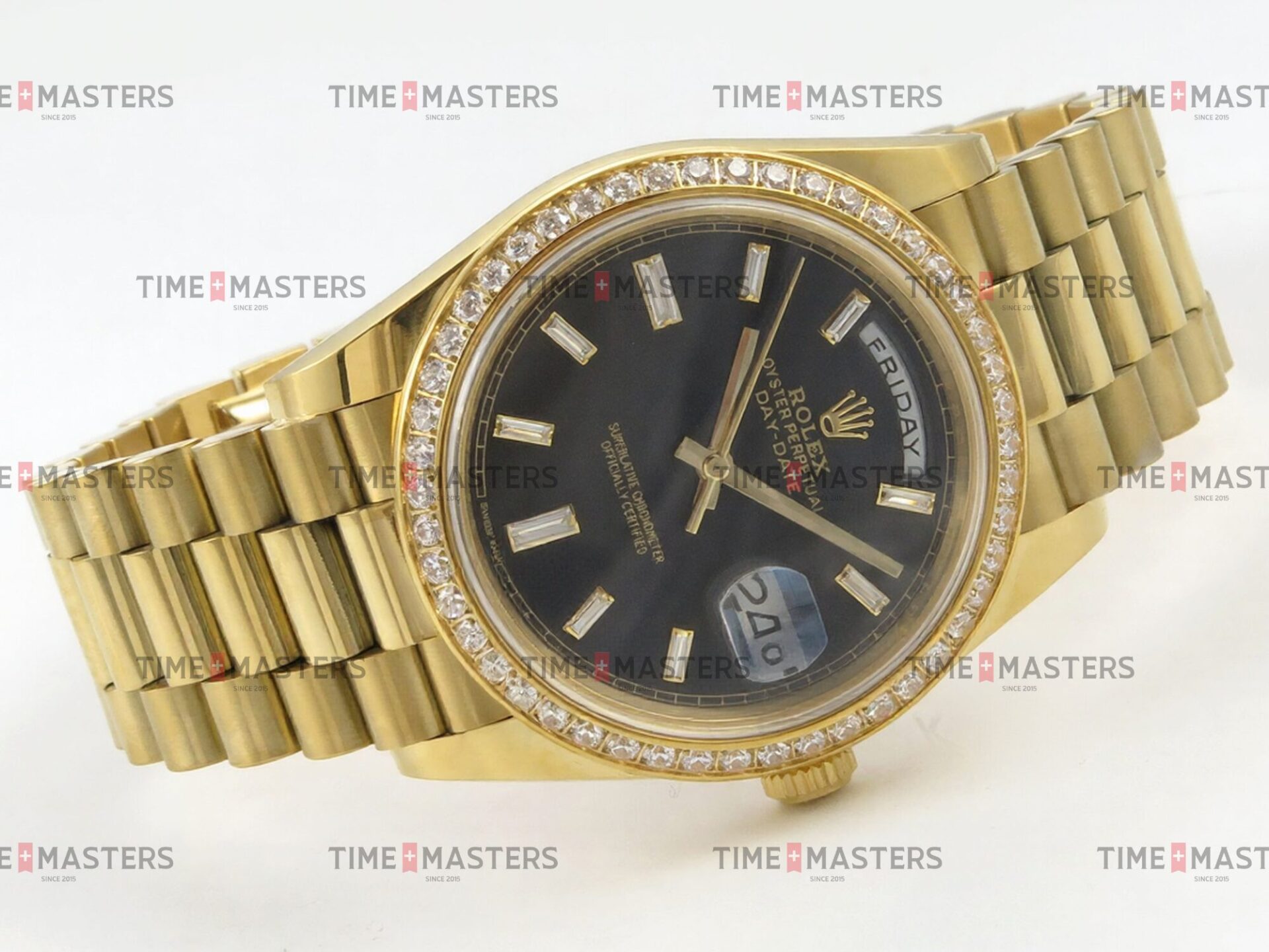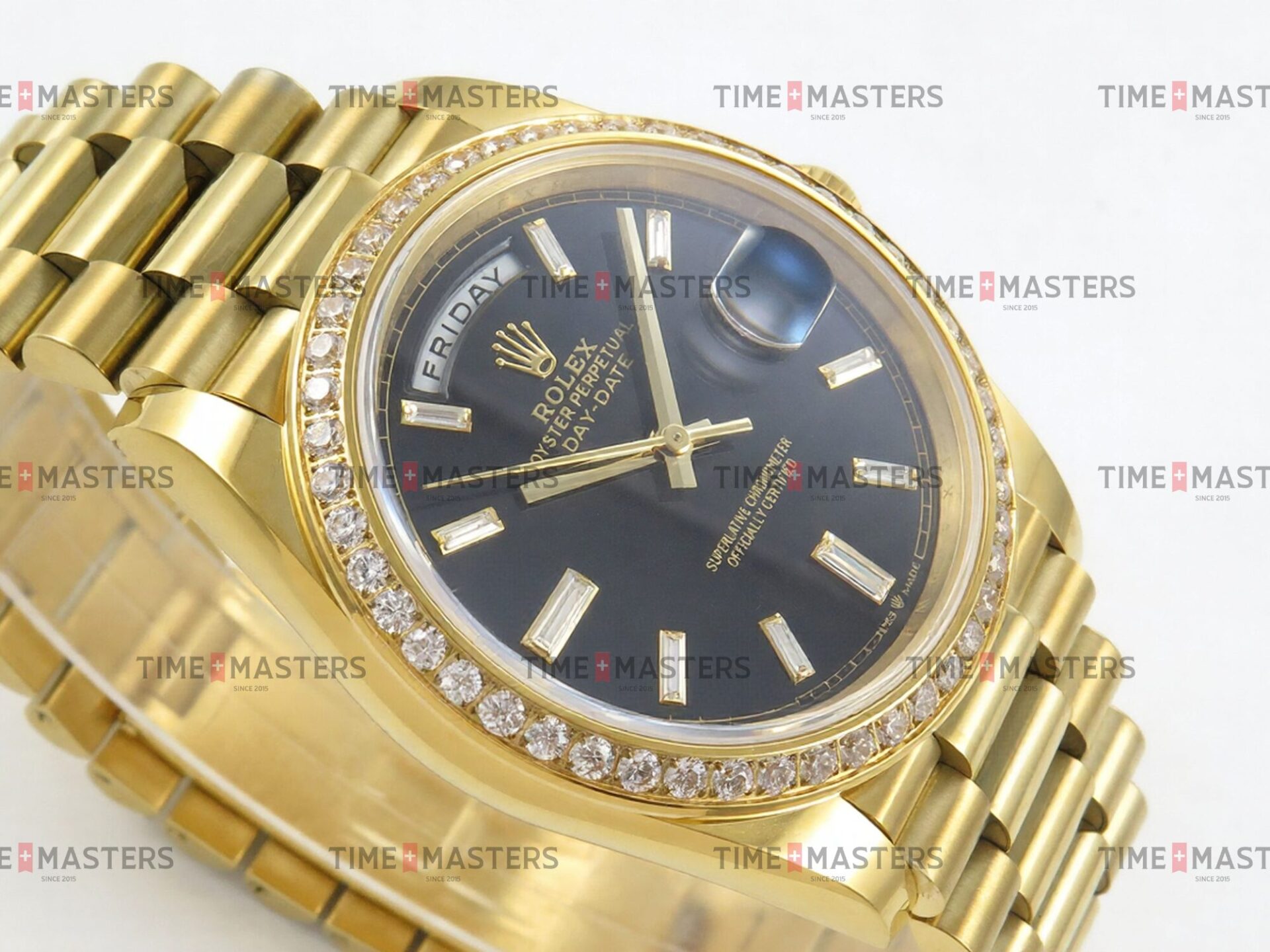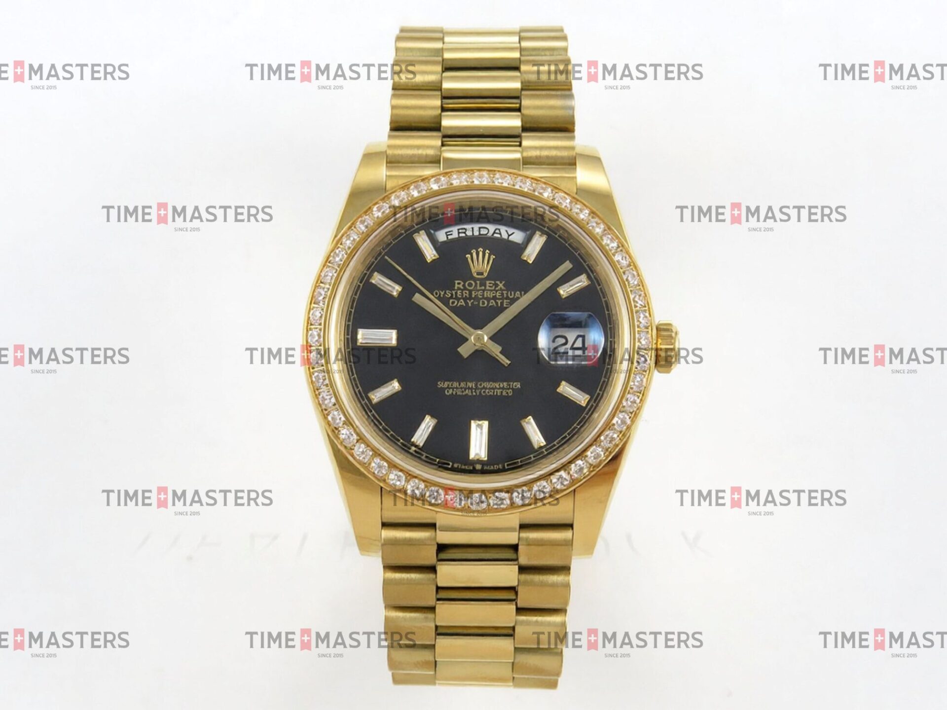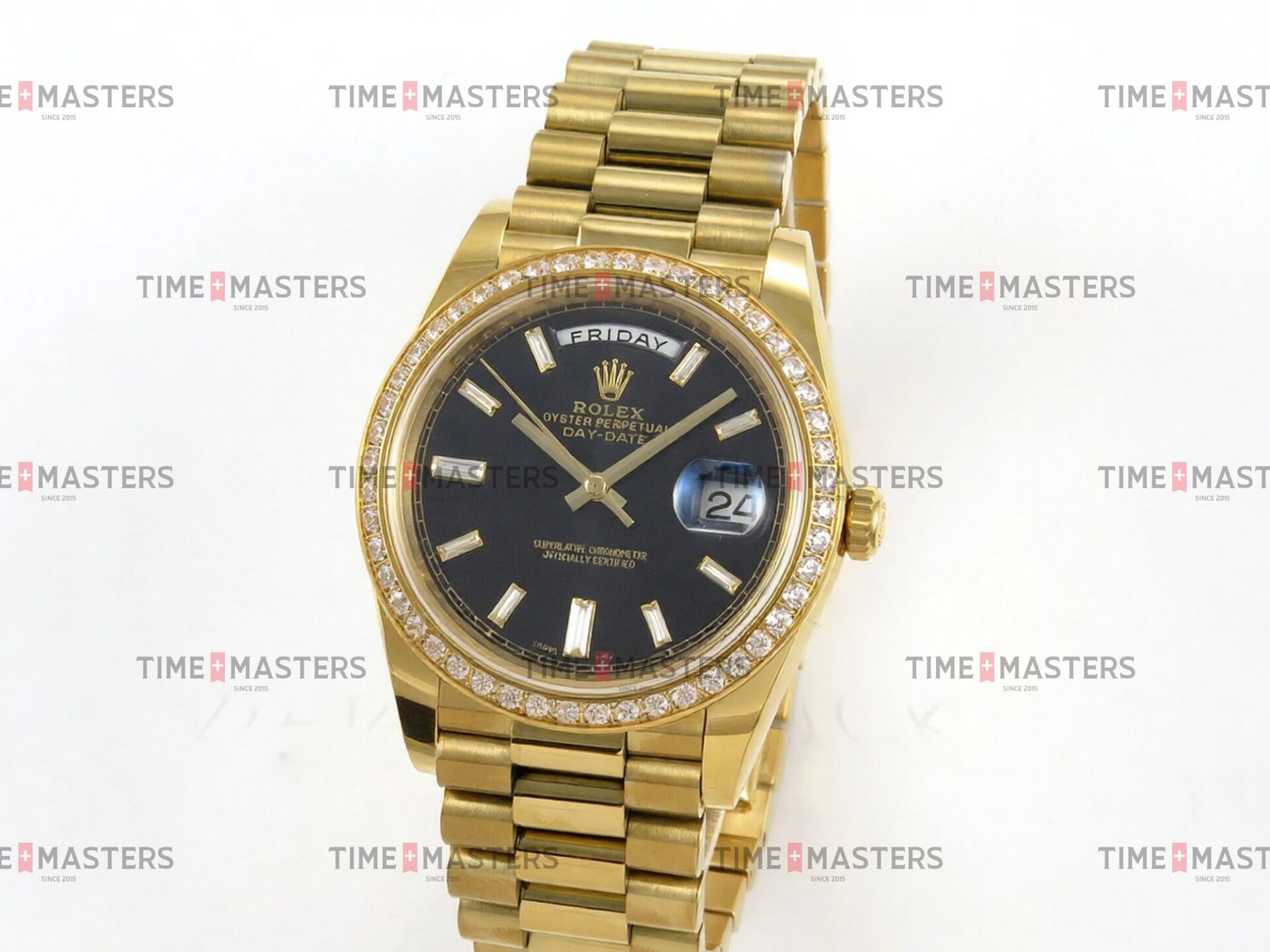Rolex Day-Date – 40 mm – זהב צהוב לוח שחור יהלומים באזל יהלומים גימור קצה