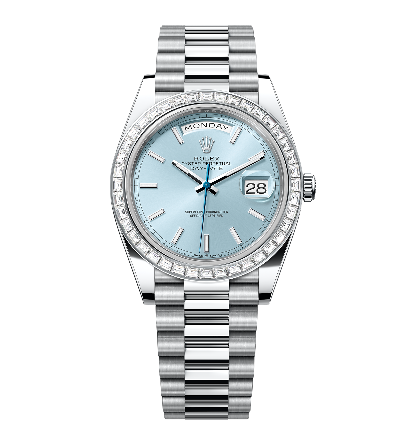 Rolex Day-Date – 40 mm – פלטינה לוח תכלת באזל יהלומים גימור שוויצרי