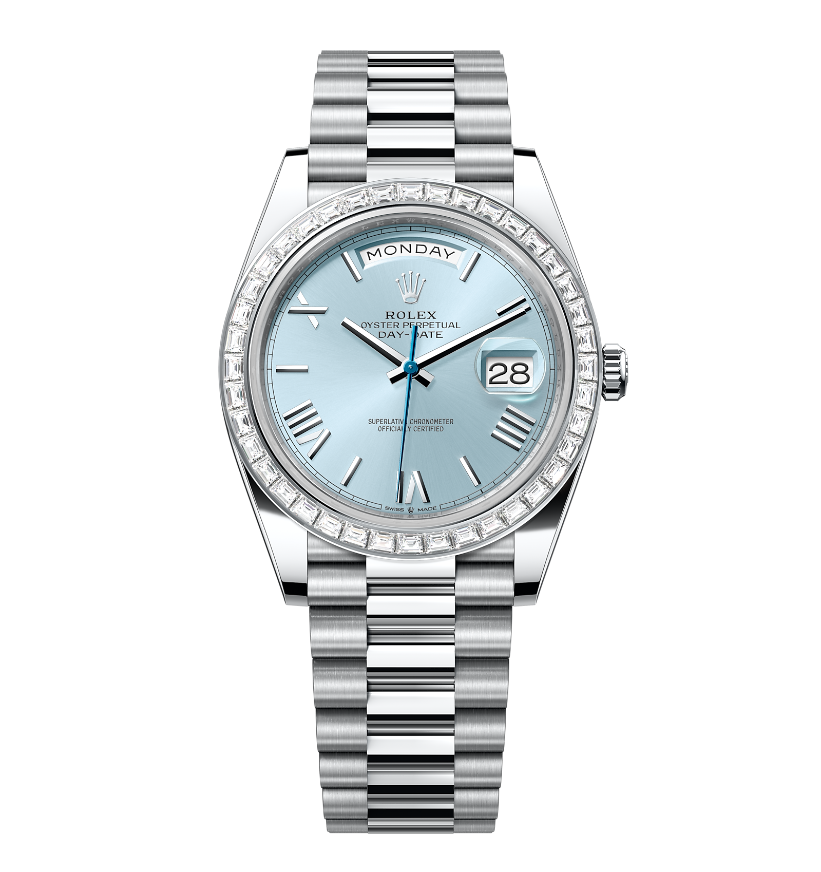 Rolex Day-Date – 40 mm – פלטינה לוח תכלת רומי באזל יהלומים גימור שוויצרי