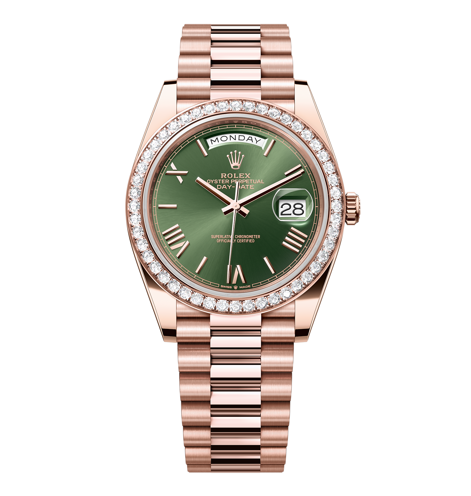 Rolex Day-Date – 40 mm – רוז גולד לוח ירוק רומי באזל יהלומים גימור קצה
