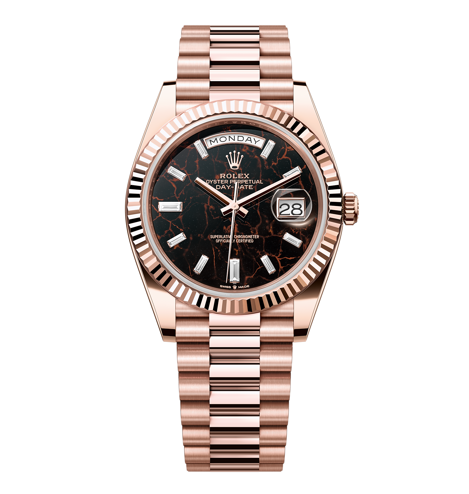 Rolex Day-Date – 40 mm – רוז גולד לוח מטאור יהלומים גימור קצה