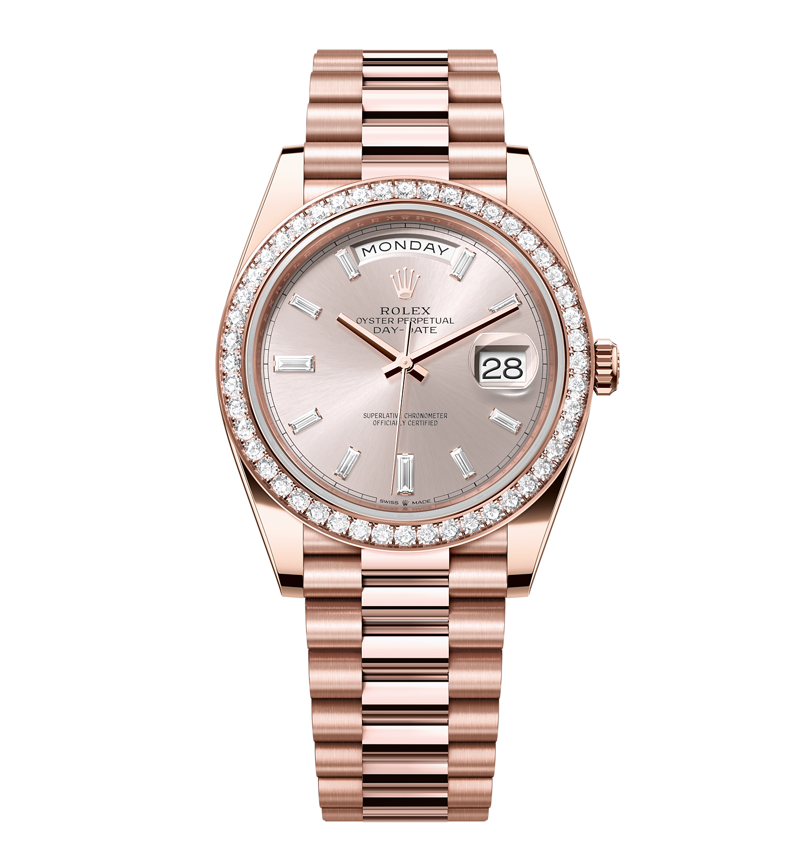 Rolex Day-Date – 40 mm – רוז גולד לוח רוז יהלומים באזל יהלומים גימור קצה
