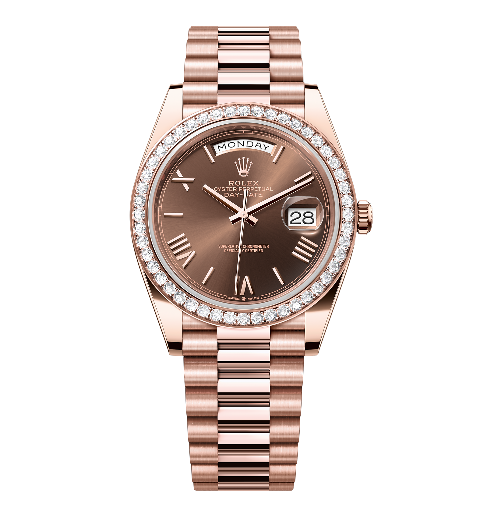 Rolex Day-Date – 40 mm – רוז גולד לוח שוקולד דומי באזל יהלומים גימור שוויצרי