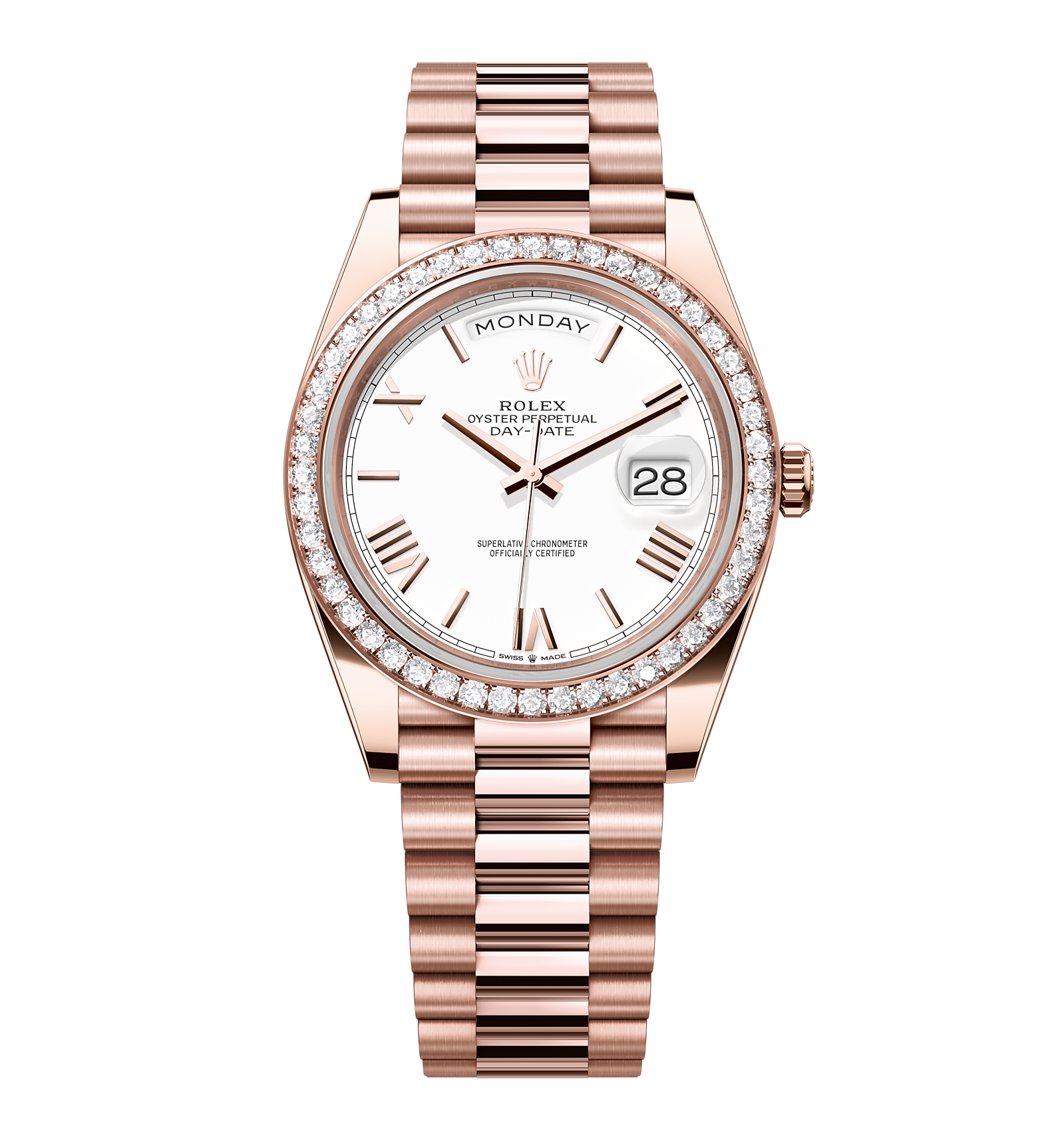 Rolex Day-Date – 40 mm – רוז גולד לו לבן רומי באזל יהלומים גימור קצה