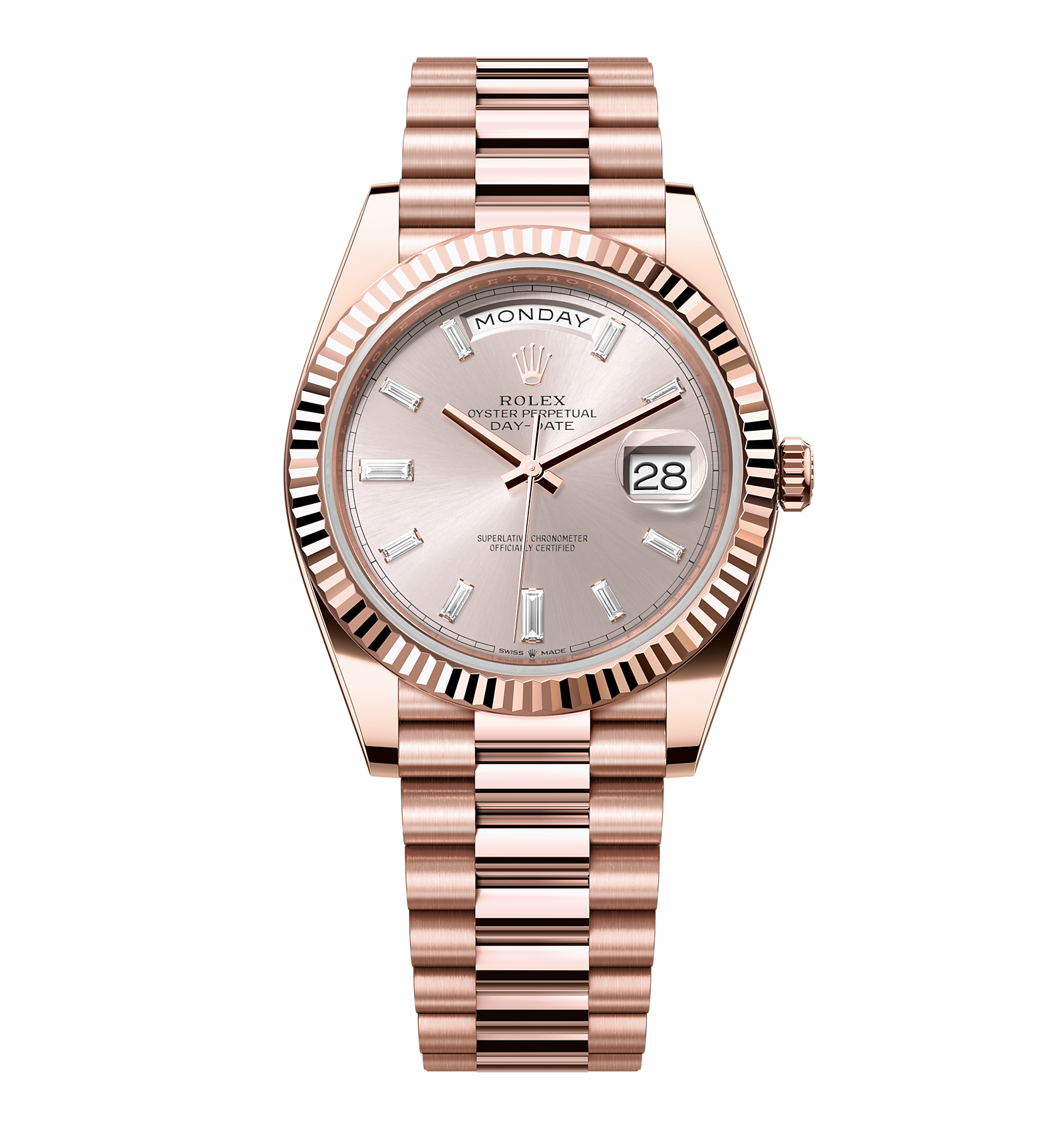 Rolex Day-Date – 40 mm – רולד גולד לוח רוז יהלומים גימור קצה