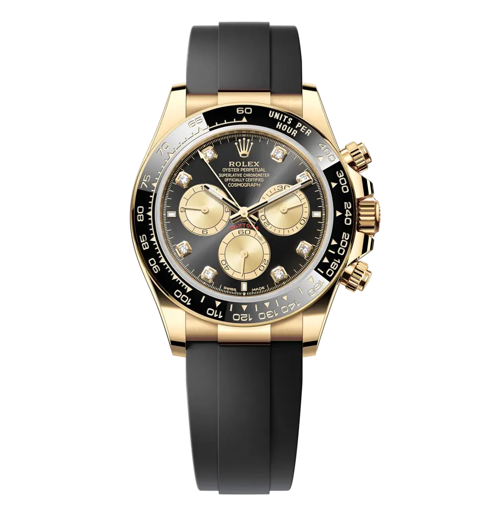 Rolex Daytona Cosmograph – 40 mm -זהב צהוב לוח שחור יהלומים רצעות אויסטרפלקס גימור קצה
