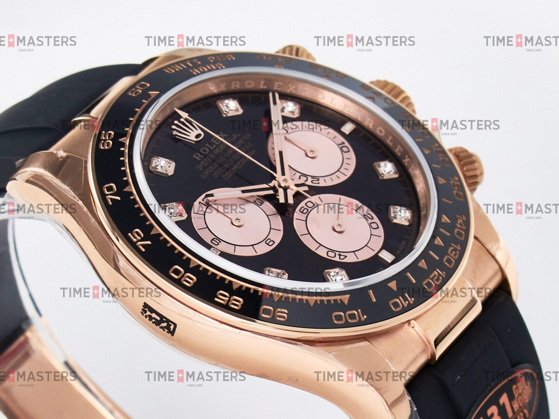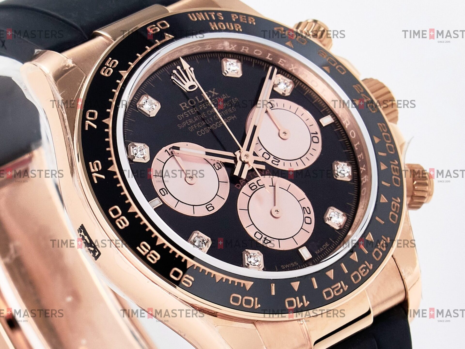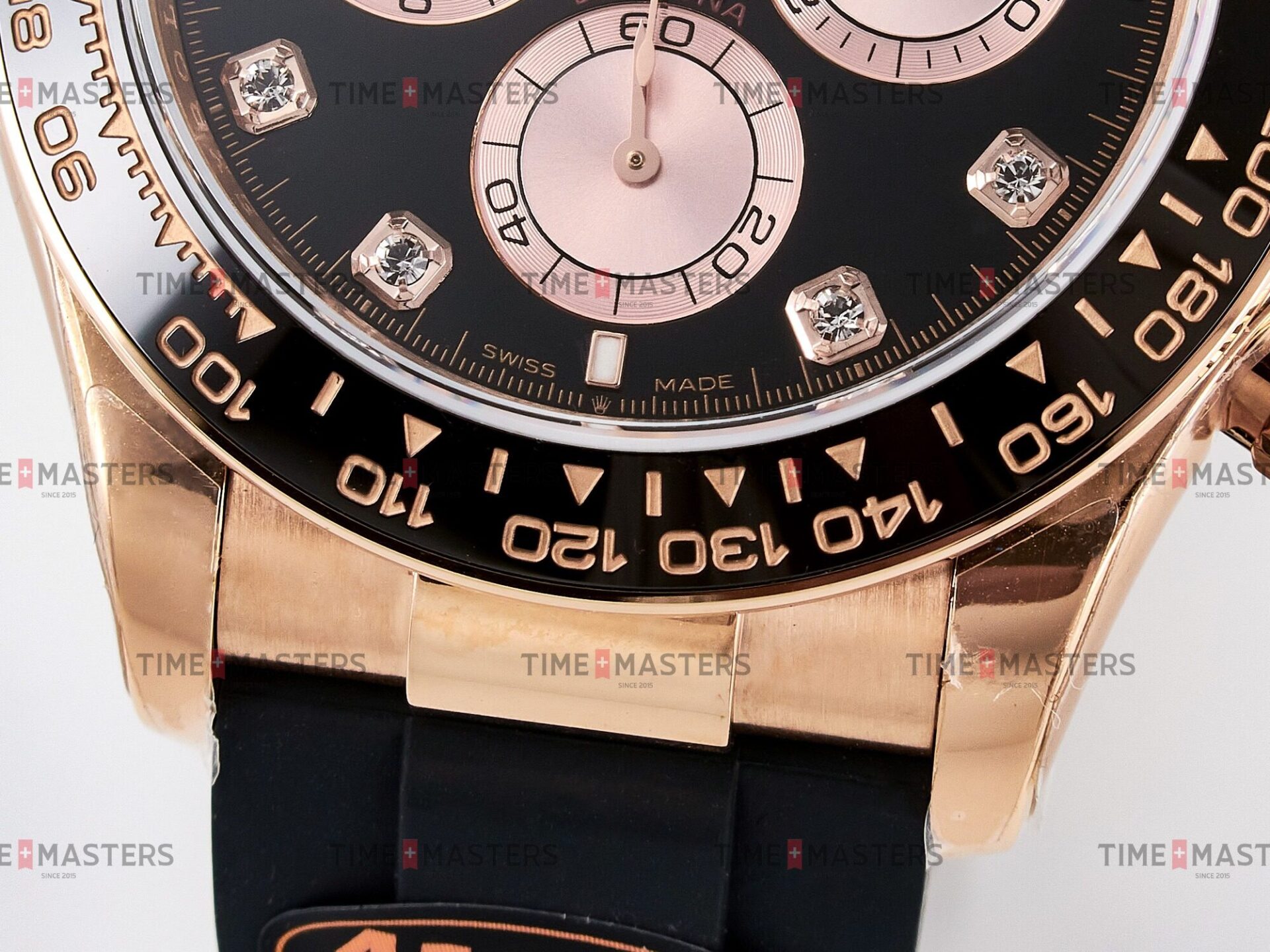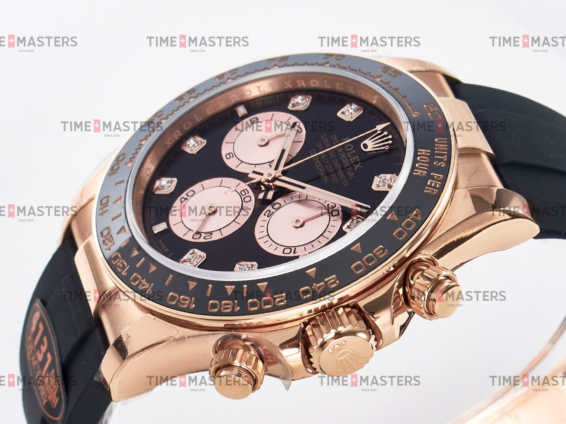 Rolex Daytona Cosmograph – 40 mm – רוז גולד לוח שחור יהולומים רצעות אויסטרפלקס גימור קצה