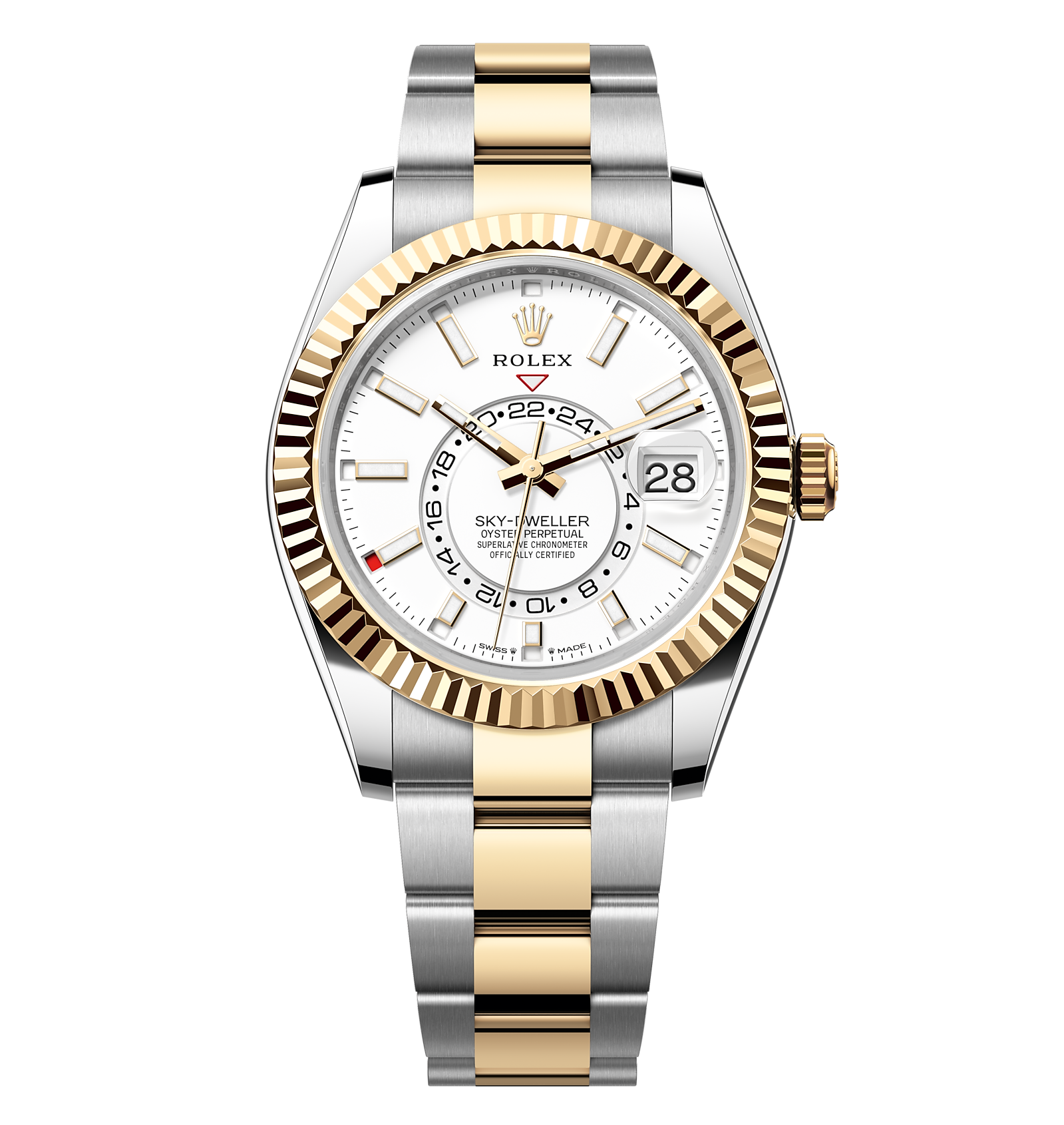 Rolex Sky Dweller – 42 mm – טו טון זהב צוהב לוח לבן רצועת אויסטר גימור קצה