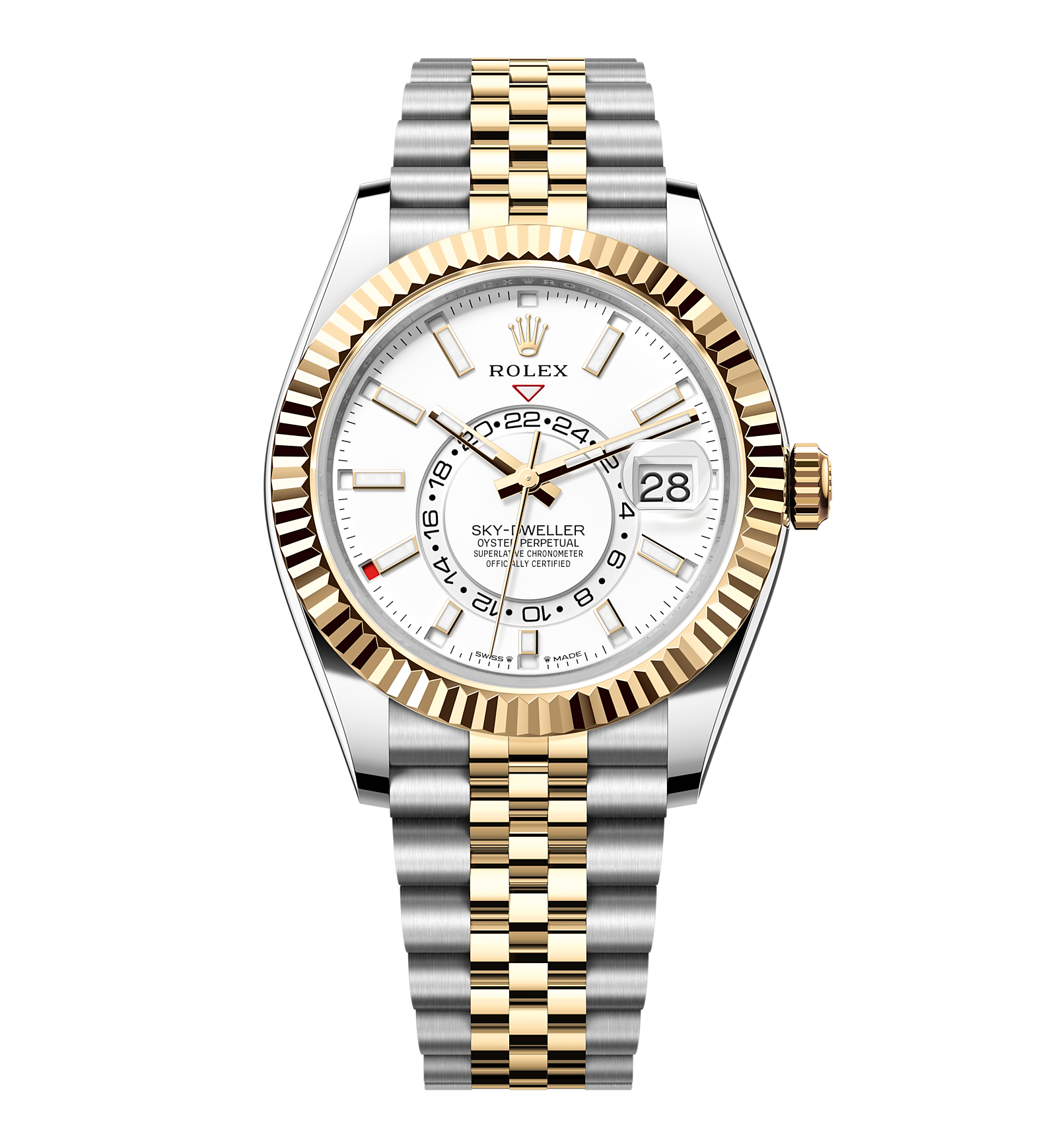 Rolex Sky Dweller – 42 mm – טו טון זהב צוהב לוח לבן רצועת ג׳ובלי גימור קצה