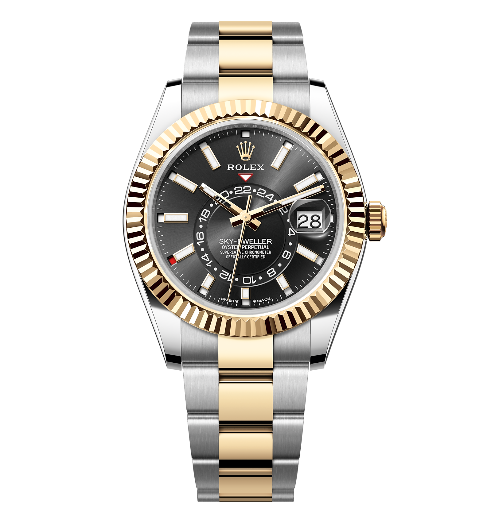 Rolex Sky Dweller – 42 mm – טו טון זהב צוהב לוח שחור רצועת אויסטר גימור קצה